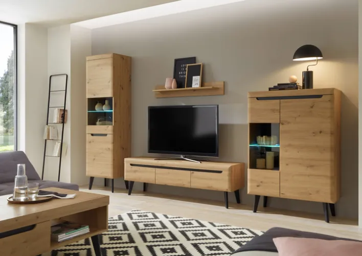 Die Wohnwand TORGE vereint modernes Design mit funktionaler Eleganz. Gefertigt aus Holznachbildung in Artisan Eiche mit schwarzen Applikationen, bietet sie eine warme und einladende Optik. Die Kombination aus klaren Linien und der natürlichen Holzmaserung verleiht jedem Raum eine stilvolle Atmosphäre. Die Wohnwand besteht aus vier Teilen: zwei Vitrinen, einem Lowboard und einem Wandboard. Die Vitrinen sind mit Klarglas ausgestattet und bieten ausreichend Stauraum für dekorative Elemente oder Alltagsgegenstände.