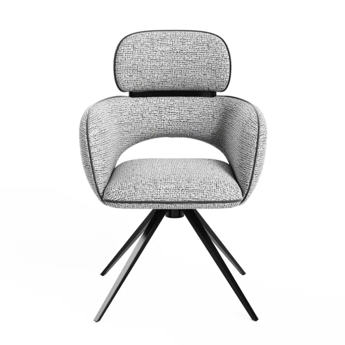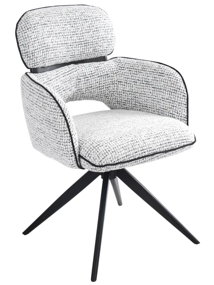 Das Design des Stuhls zeichnet sich durch ein festes, nicht verstellbares Armteil aus, das zusätzlichen Komfort bietet. Das Vierfußgestell aus Metall sorgt für Stabilität und unterstreicht den modernen Stil des Möbelstücks. Der Stoffbezug zeigt ein feines Muster, das dem Stuhl eine besondere Textur verleiht und ihn zu einem Blickfang in jedem Raum macht. Ideal für den Einsatz in Esszimmern oder Büros, passt dieser Stuhl perfekt in eine Vielzahl von Einrichtungsstilen.