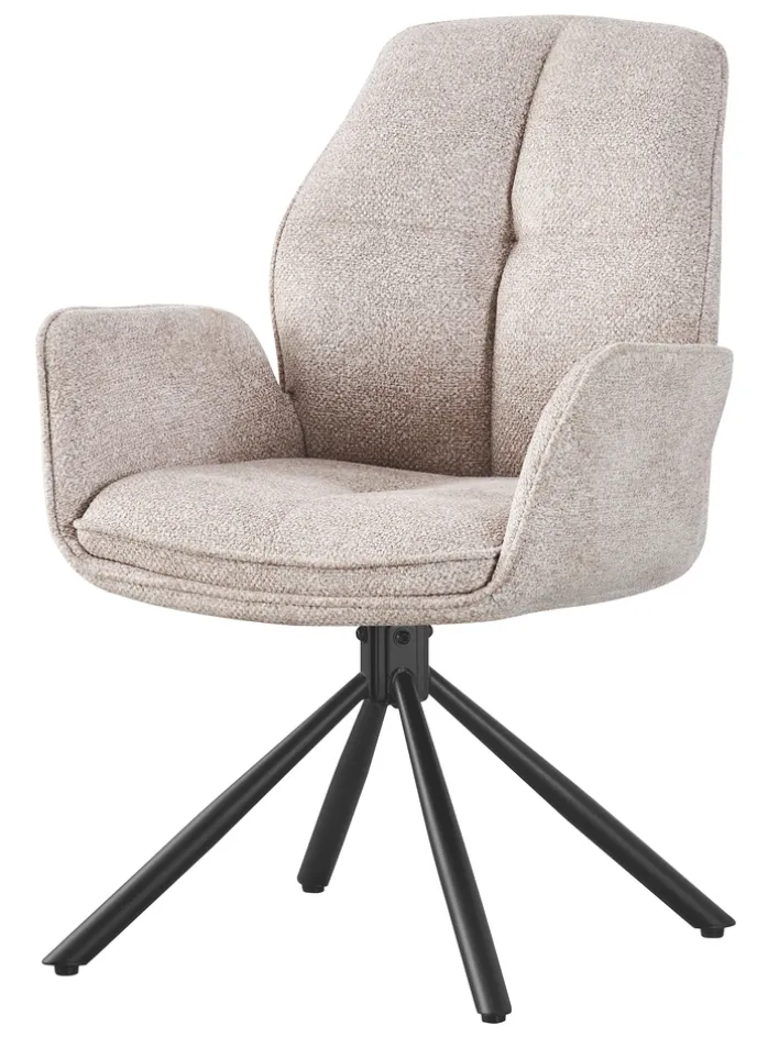 Der Armlehnstuhl LARA basiert auf einem schwarzen Metallgestell und lässt sich mit maximal 120 kg belasten. Seine bequem gepolsterte Sitzschale ist mit einem hochwertigen Webstoff bezogen und zieht mit Steppnähten Blicke auf sich. Dank hoher, ergonomisch geformter Rückenlehne bleibt der Stuhl auch bei längerem Verweilen komfortabel, während die Armlehnen beim Aufstehen unterstützen. Noch leichter gelingt das Aufstehen vom Tisch durch die 360° Drehfunktion.