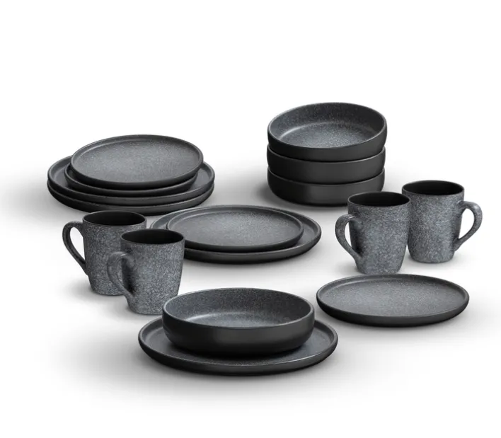 Das Set besteht aus 16 Teilen, die für bis zu vier Personen geeignet sind. Es umfasst vier Kaffeebecher mit einem Fassungsvermögen von 400 ml, vier Dessertteller mit einem Durchmesser von 21,5 cm, vier Schalen mit einem Durchmesser von 20,5 cm und einer Höhe von 4,8 cm sowie vier flache Teller mit einem Durchmesser von 26,5 cm. Die runde Form der Geschirrteile verleiht dem Set eine zeitlose Eleganz, die sich nahtlos in jede Tischdekoration einfügt.