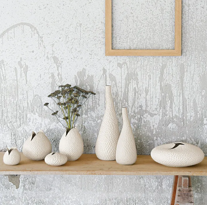Die elegante ASA Keramik Vase CARVE hat eine Höhe von etwa 10 cm und überzeugt durch ihre Oberflächen in der Farbe beige mit eingearbeitetem Relief. Einzeln oder auch in Kombination mit weiteren Dekogefäßen passt die schöne Vase in modern und klassisch eingerichtete Raumkonzepte. Durch die attraktive Farbe und die schöne Oberflächenstruktur fällt sie sofort ins Auge und ist ein Blickfang. Die handgearbeitete Vase passt auf Kommoden, Sideboards, Regale oder auch in eine Vitrine in Wohnzimmern, Esszimmern und Schlafzimmern.