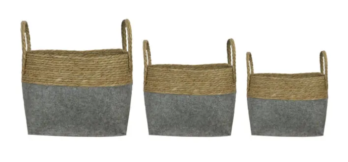 Der Aufbewahrungskorb Seegras misst in Breite und Höhe 38 x 24 cm. Seine Farben sind Grau und Braun. Der Dekokorb ist mit 2 Tragehenkel ausgestattet. Er zeigt eine Seiloptik aus dem Naturmaterial Seegras und einen grauen Filz. Seine Tiefe beträgt 24 cm.