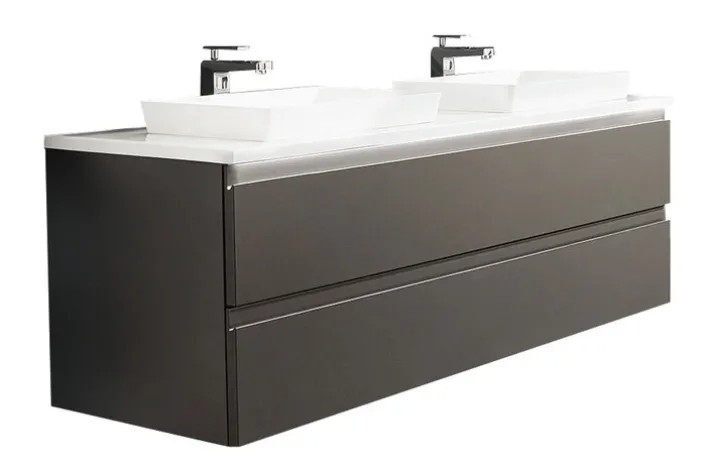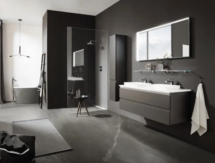 Mit dem 141,2 cm breiten b.collection Waschplatz STRAIGHT in der Trendfarbe Cosmos Grey Matt lässt sich das Badezimmer mit einem praktischen Doppelwaschbecken und viel Stauraum ausstatten.