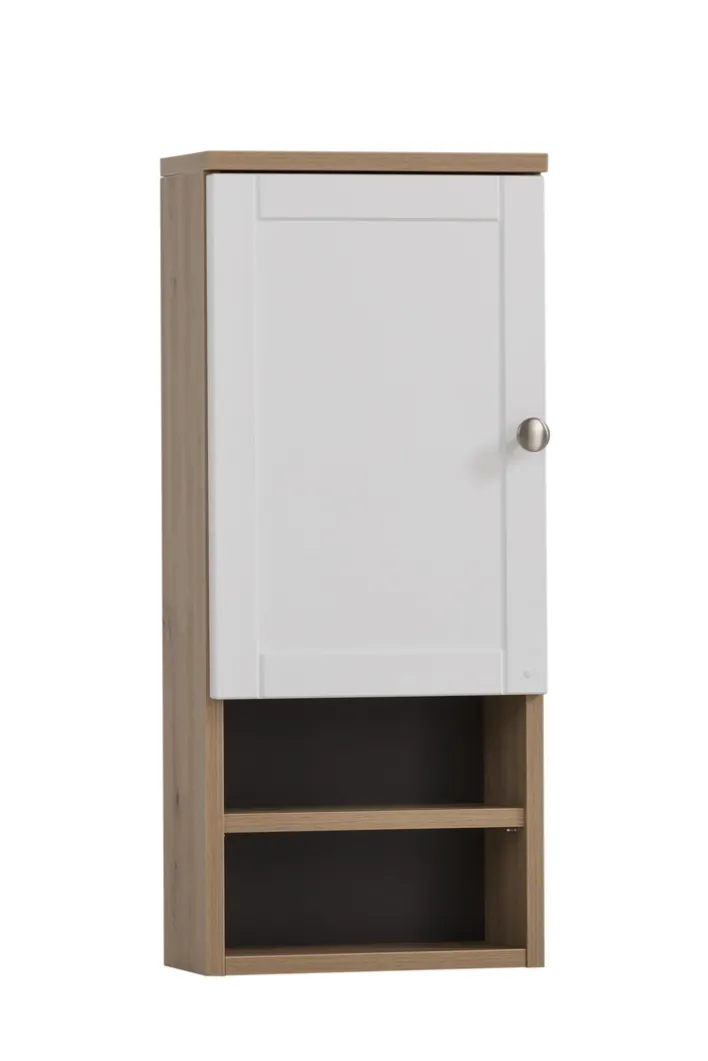 Ein optisches Highlight ist beim Bad-Hängeschrank JESPER weiß mit einer Breite von 30,3 cm die Drehtür in Landhausoptik. Sie setzt sich auch farblich deutlich vom braunen Korpus sowie dem unteren, offenen Regalteil in gleichem Design ab.