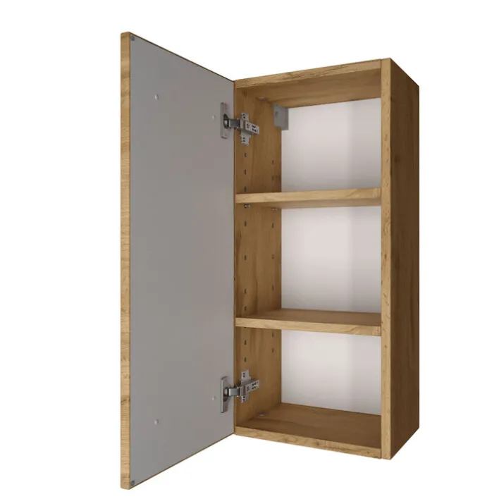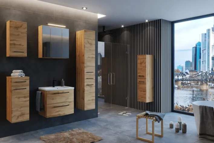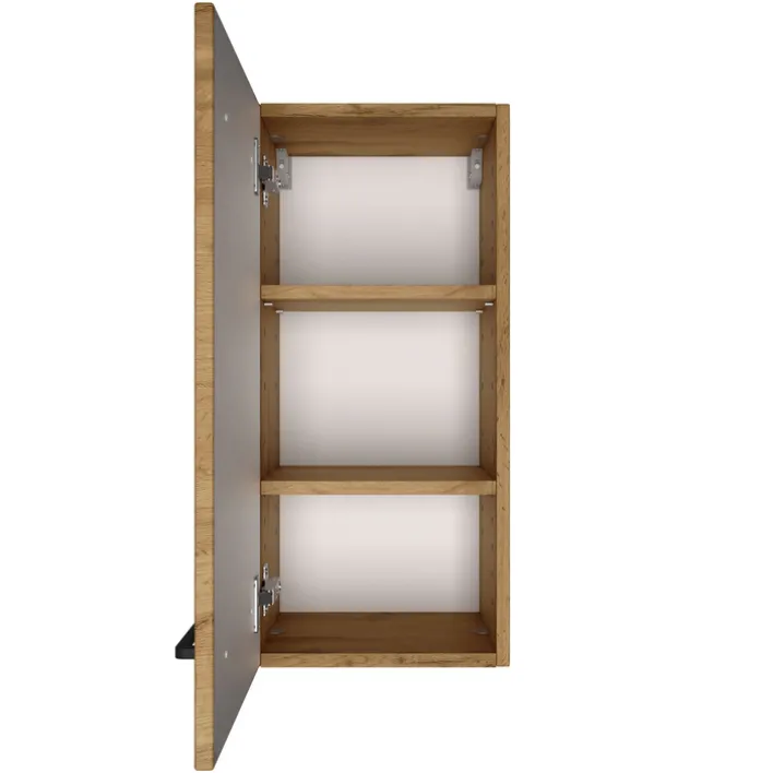 Der LIMBURG Bad-Hängeschrank in Braun ist mit seinen 30 cm Breite ein echtes Platzwunder in naturbelassener Optik und einer warmen Farbgebung – dank der Wotan-Eiche-Nachbildung, die sowohl die Front als auch Seiten des Schranks umhüllt. Die farblich abgesetzten schwarzen Metallgriffe schaffen einen willkommenen Kontrast und greifen mit ihrem minimalistischen Design die schnörkellose und klare Formgebung des Schranks auf.