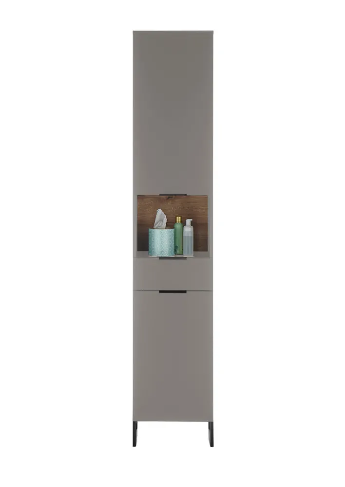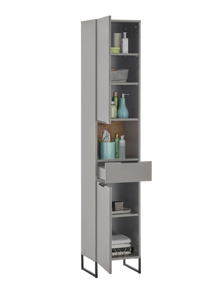 Das Bad Highboard präsentiert sich in einem modernen Design mit klaren Linien und einer eleganten grauen Farbgebung. Die Hauptfarbe Grau wird durch Akzente in Braun und einem Dekor in Evoke Eiche ergänzt, was dem Möbelstück eine warme und natürliche Ausstrahlung verleiht. Die Maße des Highboards betragen 60 cm in der Breite, 106 cm in der Höhe und 32 cm in der Tiefe, was es zu einer kompakten und dennoch geräumigen Lösung für Ihr Badezimmer macht.