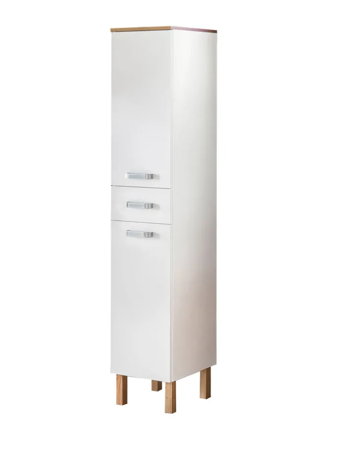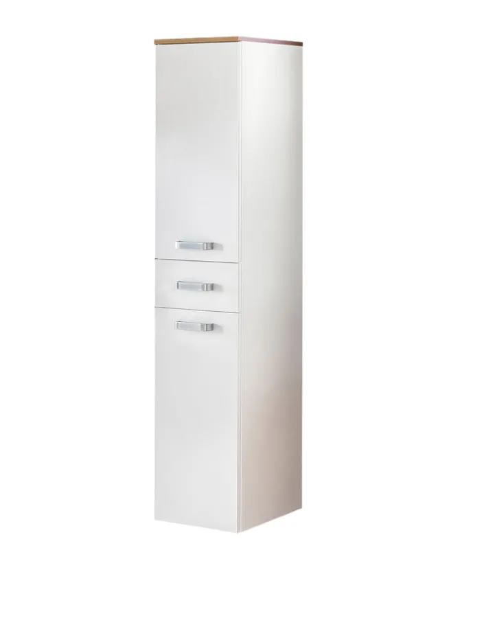 Der Hochschrank verfügt über eine Tür und einen Schubkasten, die beide mit Soft-Close-Funktion ausgestattet sind, um ein sanftes und leises Schließen zu gewährleisten. Zwei Einlegeböden bieten zusätzlichen Stauraum für Handtücher, Pflegeprodukte und andere Badutensilien. Die klaren Linien und das moderne Design machen diesen Schrank zu einem zeitlosen Element in jedem Badezimmer.