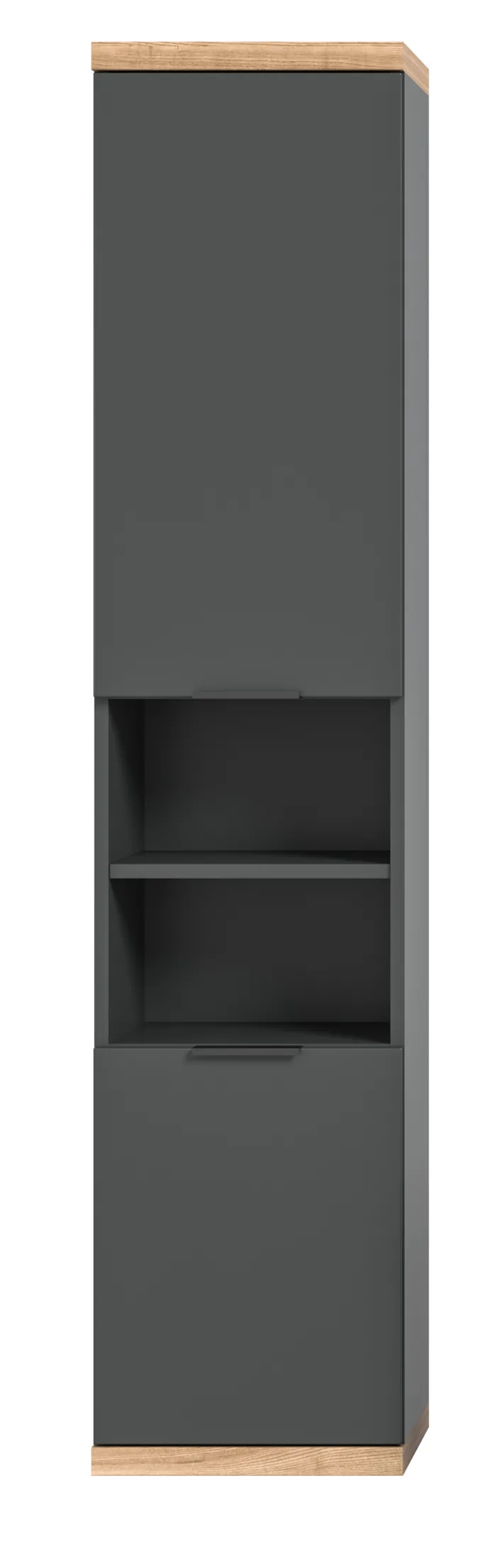 Der Hochschrank für das Bad präsentiert sich in einem modernen Design, das durch seine klare Linienführung und die Kombination aus Anthrazit und Nox Oak Nachbildung besticht. Mit einer Breite von 35 cm, einer Höhe von 161 cm und einer Tiefe von 31 cm bietet er eine kompakte Lösung für zusätzlichen Stauraum im Badezimmer. Die Hauptfarbe Grau harmoniert perfekt mit den braunen Akzenten, die dem Schrank eine warme Note verleihen.