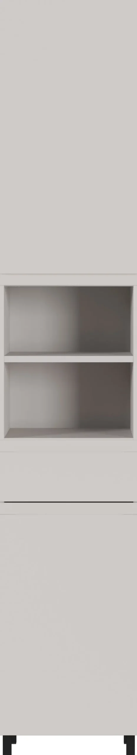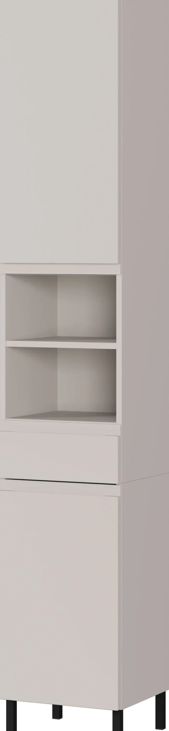 Der Hochschrank aus der Serie SALINAS präsentiert sich in einem schlichten, modernen Design mit klaren Linien. Die Hauptfarbe ist ein mattes Kaschmir, das laut Produktdatenblatt einer folierten MDF-Oberfläche entspricht. Die Fronten und der Korpus sind in diesem Farbton gehalten und sorgen für ein ruhiges, zeitloses Erscheinungsbild, das sich gut in verschiedene Badezimmerumgebungen integrieren lässt. Die abgebildeten Füße bestehen aus schwarzem Material und setzen einen dezenten Kontrast zur hellen Oberfläche. Die Gesamtmaße des Schranks betragen 34 cm in der Breite, 190 cm in der Höhe und 34 cm in der Tiefe, was das Möbelstück schlank und platzsparend macht. Die Konstruktion basiert auf mitteldichten Faserplatten, die mit Melaminharzbeschichtung versehen sind. Zwei geschlossene Fächer und ein offenes Mittelteil mit zwei Ablageflächen bieten funktionalen Stauraum für Badutensilien. Die sichtbare, grifflose Front trägt zur klaren Optik bei. Der Hochschrank eignet sich speziell für den Einsatz im Badezimmer und ist auf Langlebigkeit sowie einfache Pflege ausgelegt.