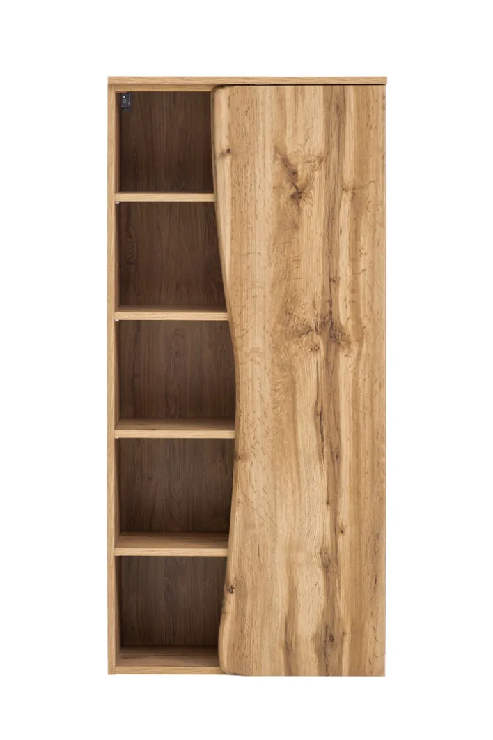 Das Bad-Midiregal ANTWERPEN in Braun mit einer Breite von 60 cm, einer Höhe von 130 cm und einer Tiefe von 35 cm präsentiert sich als praktische und stilvolle Lösung für zusätzlichen Stauraum im Badezimmer. Die helle Wotaneiche-Nachbildung verleiht dem Regal eine warme und natürliche Ausstrahlung, während die Baumstammkante an der Tür für eine rustikale Note sorgt. Das Regal ist mit einer Tür und insgesamt 8 Einlegeböden ausgestattet, die vielfältige Möglichkeiten zur Aufbewahrung von Badutensilien bieten. Die 4 Möbelfüße sorgen für eine stabile und standfeste Positionierung des Regals.