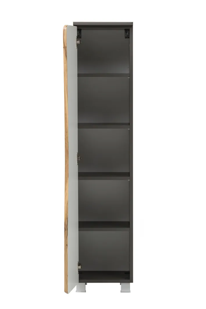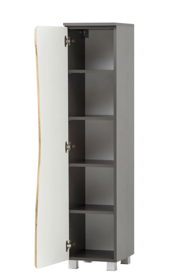 Mit dem Bad-Midischrank ANTWERPEN braun/grau 30cm x 130 cm Höhe und 35 cm Tiefe schafft man viel Stauraum im Badezimmer. Da er auf vier Möbelfüßen steht, steht er auch auf Badezimmerböden mit leichter Schrägneigung gerade und stabil. Die Oberflächenbeschichtung in Form eines Furniers ist leicht zu reinigen und feuchtigkeitsbeständig. Für eine einzigartige Optik sorgt die Schranktür allein durch ihre Baumschnittkante, die ihr ihr eine individuelle, stilvolle Optik verleiht.