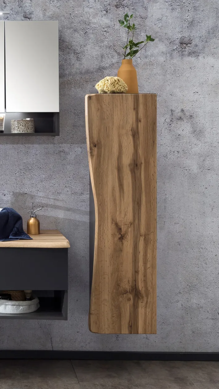Der Bad-Midischrank ANTWERPEN braun/grau 30cm aus Wotaneiche Nachbildung sorgt für ein modernes und gleichzeitig natürliches Flair im Bad. Auffallend ist die Tür mit Baumkante, die den Schrank zum Blickfang macht.