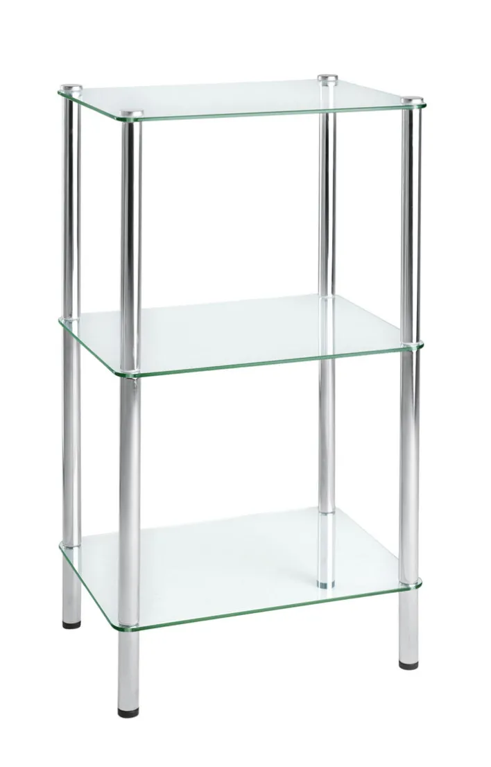 Klar und elegant, wie es ist, lässt sich dieses Regal überall aufstellen. Seine Füße sind mit schwarzen Gummiflächen ausgestattet, sodass Ihre Fliesen im Bad geschont werden. Auf dem Regal lässt sich alles abstellen, was Sie im Bad benötigen: eine Schale mit Kämmen und Haarnadeln, Rasierzubehör, Kosmetiktücher und Wattepads, Lotionen und Deos oder auch Make-up-Produkte. Sehr attraktiv sehen Parfümflaschen aus farbigem oder hellem Glas auf den transparenten Glasböden aus. Natürlich können Sie hier auch gerollte Handtücher in verschiedenen Farben stapeln, das ergibt ebenfalls einen schönen Kontrast. Die silberfarbigen Beine und die Glasböden passen zu jedem hellen oder dunklen Design Ihres Badezimmers. Wenn Sie möchten, stellen Sie das Bad Regal sogar im Schlafzimmer auf, denn es ist durch seine attraktive und zeitlose Optik universell einsetzbar.
