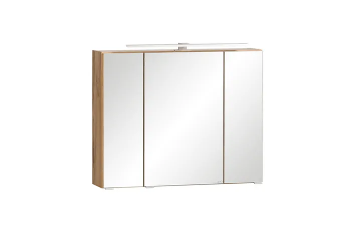 Der Bad-Spiegelschrank verfügt über drei Spiegeltüren. Im Inneren befinden sich hinter jeder Türe jeweils zwei Glaseinlegeböden für Bad-Utensilien. Diese sind höhenverstellbar. Der moderne Badschrank ist innerhalb des Korpus mit einer Steckdose sowie einem Lichtschalter ausgestattet. Hier ist es möglich, zum Beispiel einen Rasierer oder Föhn anzuschließen. Das gesamte Produkt besteht aus einer Holznachbildung. Als Dekorfarbe dient hier Eiche. Die Schrankvorderseite ist vollständig bespiegelt. Der Bad-Spiegelschrank GENT ist mit weiteren Produkten der Reihe kombinierbar.
