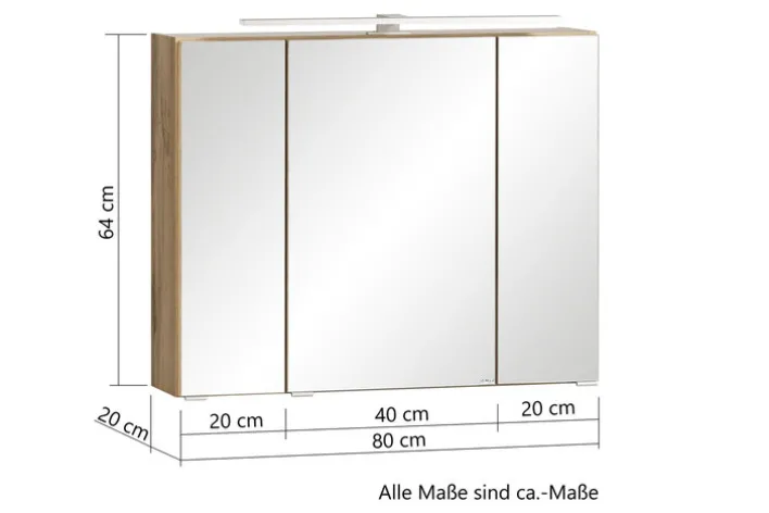Der weiß-braune Bad-Spiegelschrank GENT ist 80 cm breit, 20 cm tief und 64 cm hoch. Ausgestattet mit einer LED-Aufbauleuchte in Edelstahloptik, punktet das Möbelstück durch viel Stauraum.