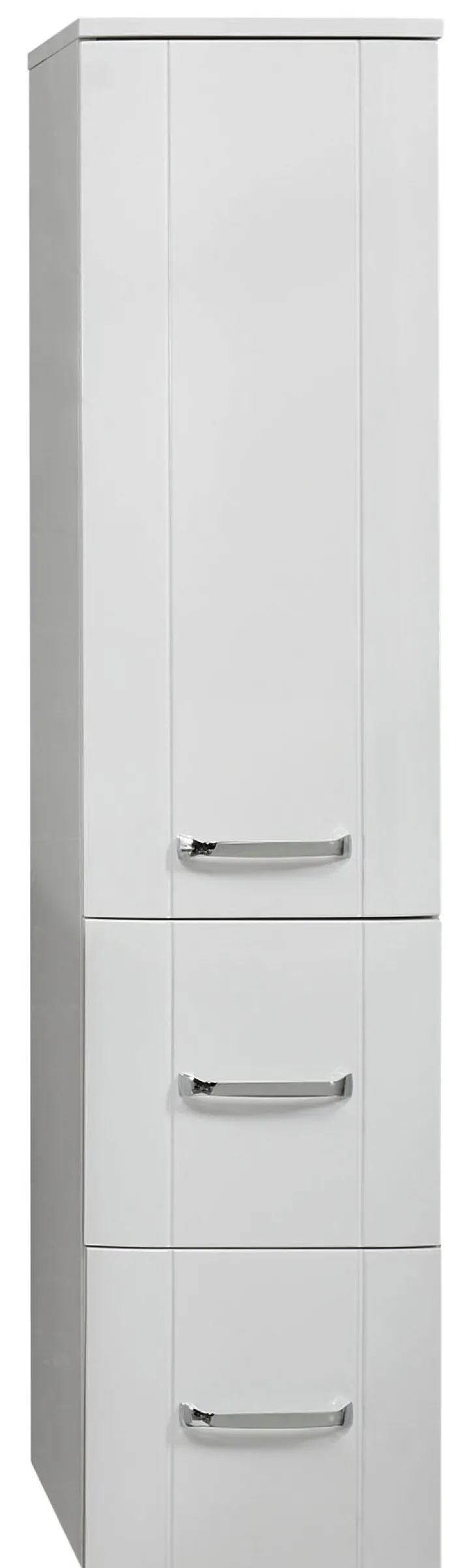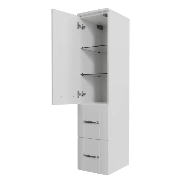 Gefertigt aus Holznachbildung, überzeugt der Schrank durch seine pflegeleichte Oberfläche. Die klaren Linien und die glänzende Oberfläche verleihen dem Möbelstück eine elegante Ausstrahlung, die sich nahtlos in moderne Badezimmer einfügt. Die silberfarbenen Griffe setzen einen stilvollen Akzent und erleichtern die Handhabung.