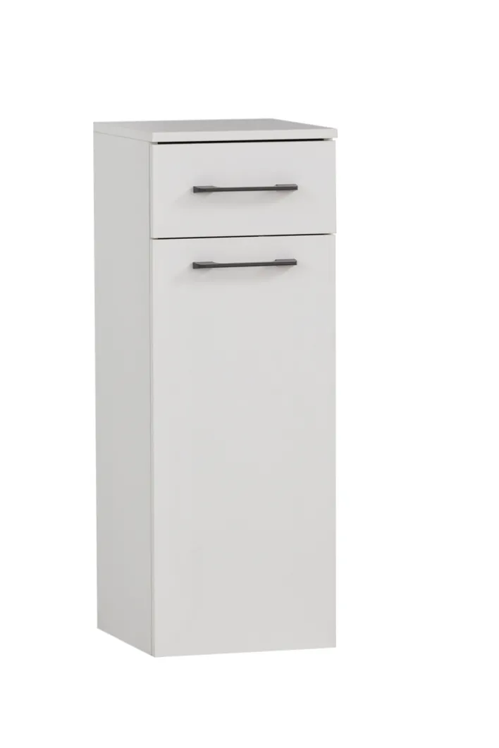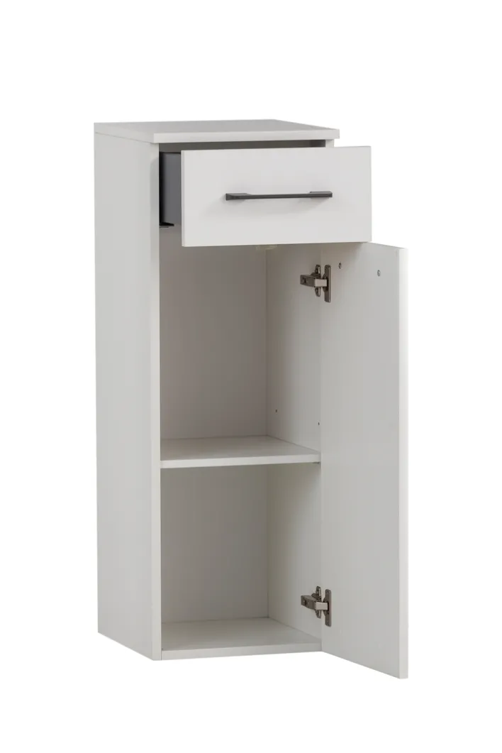 Der Unterschrank verfügt über eine Tür und eine Schublade, die beide mit einem Soft-Close-Mechanismus ausgestattet sind, um ein sanftes und geräuschloses Schließen zu gewährleisten. Ein Einlegeboden im Inneren bietet zusätzlichen Stauraum für Badutensilien. Die klaren Linien und die schlichten Griffe unterstreichen das minimalistische Design, während die weiße Oberfläche für eine helle und freundliche Atmosphäre im Badezimmer sorgt.