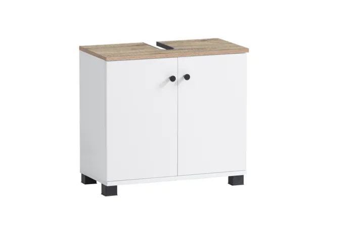 Hinter den beiden sanft schließenden Türen mit Anschlagdämpfern lassen sich im Bad-Waschbeckenunterschrank BALTO Pflegeartikel, Reinigungsmittel, Handtücher und Badutensilien ordentlich und geschützt aufbewahren. Der Oberboden in Wildeiche-Dekor setzt einen warmen Akzent und die schwarzen, matt lackierten Metallgriffe und Beschläge bilden einen modernen Kontrast. Mattschwarze Füße aus Kunststoff verleihen dem Möbelstück Stabilität und runden das stilvolle Erscheinungsbild ab. Der integrierte Siphonausschnitt ermöglicht eine einfache Montage unter dem Waschbecken.