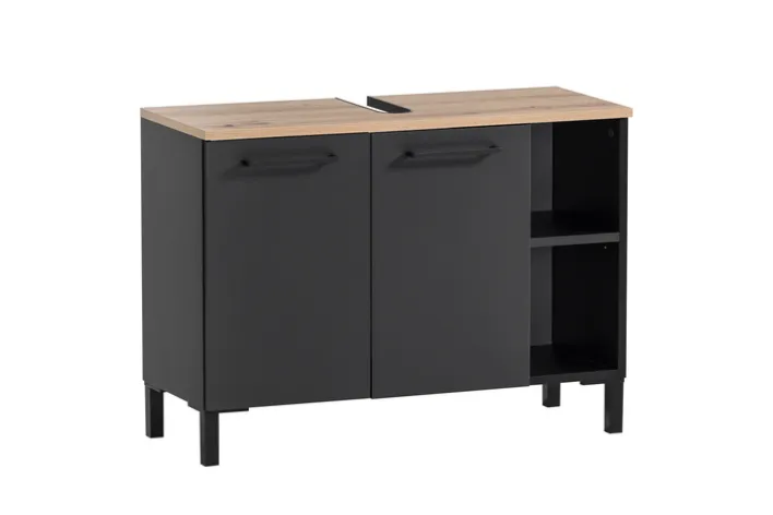 Der Unterschrank verfügt über zwei Türen und zwei offene Fächer, die vielseitige Ablagemöglichkeiten bieten. Die klaren Linien und das schlichte Design passen perfekt in ein modernes Badezimmerambiente. Die schwarzen Griffe fügen sich nahtlos in das Gesamtbild ein und unterstreichen den modernen Stil des Möbelstücks. Der Waschbeckenunterschrank ist nicht nur ein praktisches Möbelstück, sondern auch ein stilvolles Element, das Ihrem Badezimmer eine besondere Note verleiht.