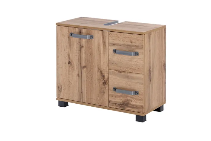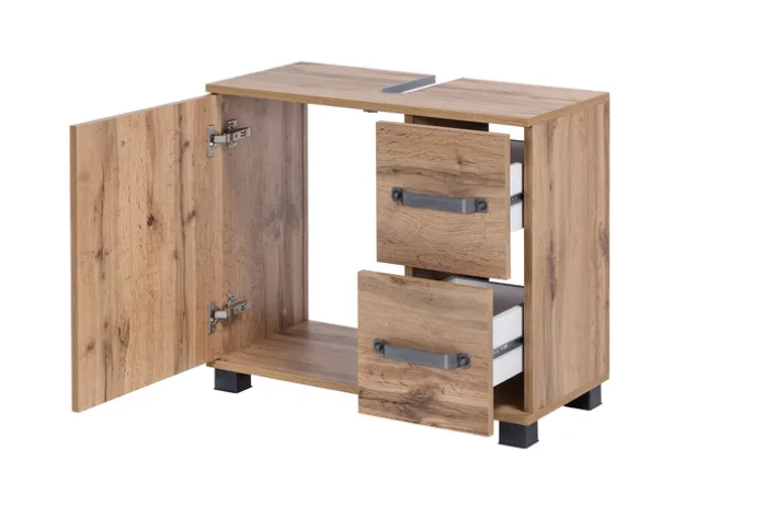 Der Unterschrank verfügt über zwei Schubkästen und eine Tür, die mit einem praktischen Soft-Close-Mechanismus ausgestattet sind, um ein sanftes und geräuschloses Schließen zu gewährleisten. Die robusten Griffe in Metalloptik verleihen dem Möbelstück einen zusätzlichen modernen Akzent. Die klaren Linien und die funktionale Gestaltung machen diesen Waschbeckenunterschrank zu einer idealen Ergänzung für jedes zeitgemäße Badezimmer.