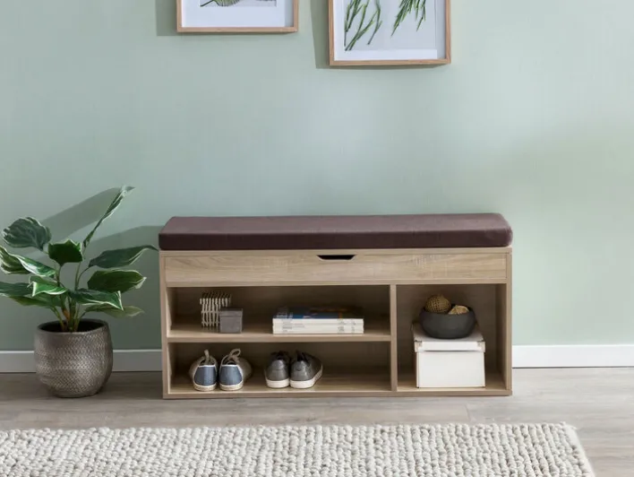 Platzsparend, bequem und ungeheuer praktisch: Die Bank ist Sitzplatz und Aufbewahrungsmöbel in einem. 104 cm breit und 51 cm hoch passt sie in Flure und Eingangsbereiche, in Wohnküchen und Kinderzimmer. Der Korpus ist aus Holznachbildung im Farbton Sonoma Eiche gefertigt und mit einem gemütlichen Sitzkissen in braunem Bezug ergänzt.
