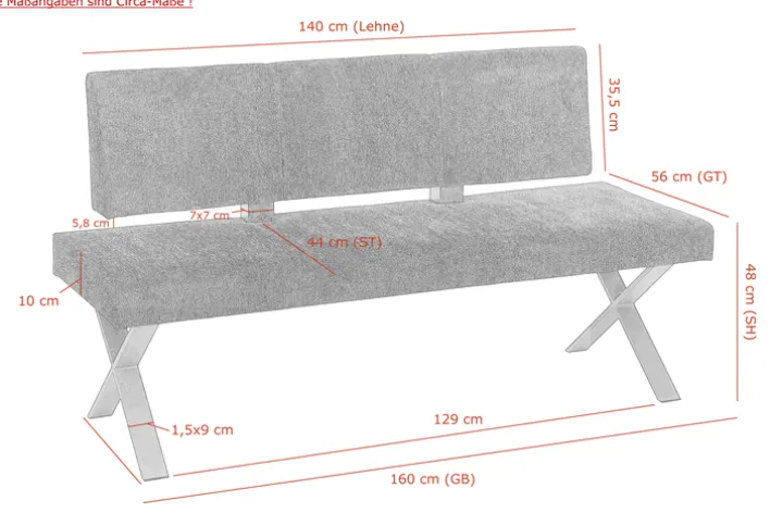 Breite: 160,00 cmHöhe: 88,00 cmTiefe/Ausladung: 56,00 cmGewicht: 31,80 kgSitzbreite: 160,00 cmSitztiefe: 44,00 cmSitzhöhe: 48,00 cmmaximale Belastbarkeit: 300,00 kgHöhe Rückenlehne: 35,50 cm