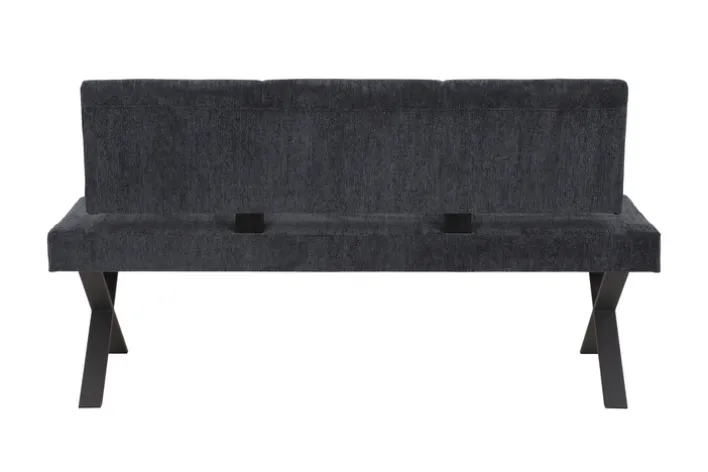 Das X-Gestell und der Unterbau der Bank MARION I bestehen aus Metall. Die Oberflächen sind pulverbeschichtet. Die weichen Polster sind mit einem strapazierfähigen Webstoff bezogen. Die Bank ist bis 300 kg belastbar.