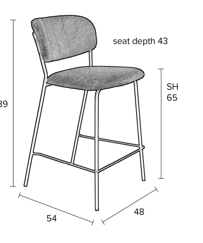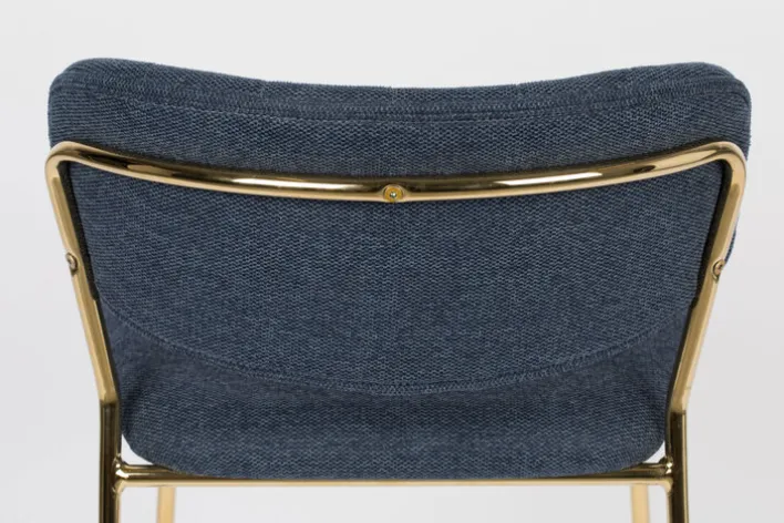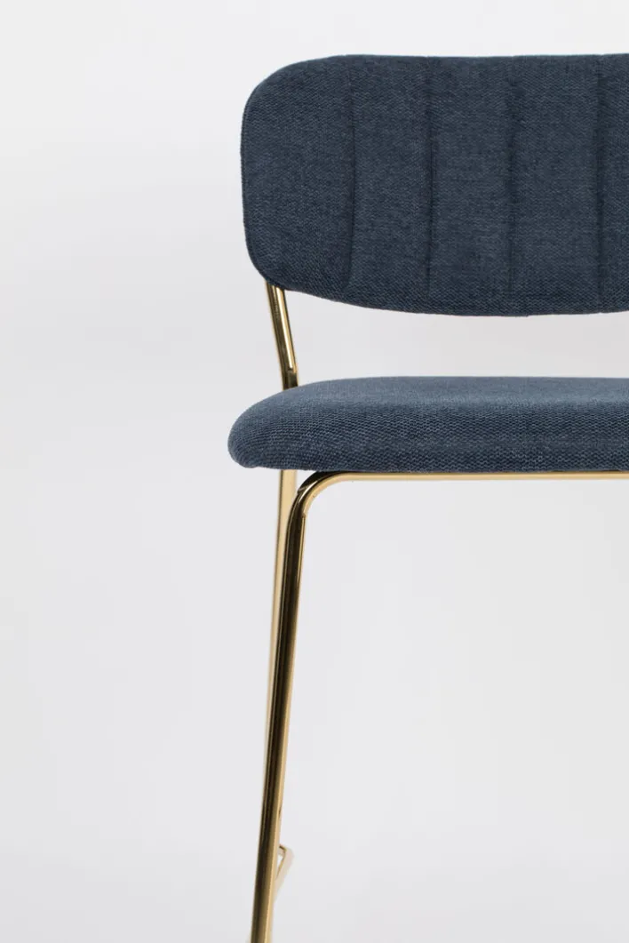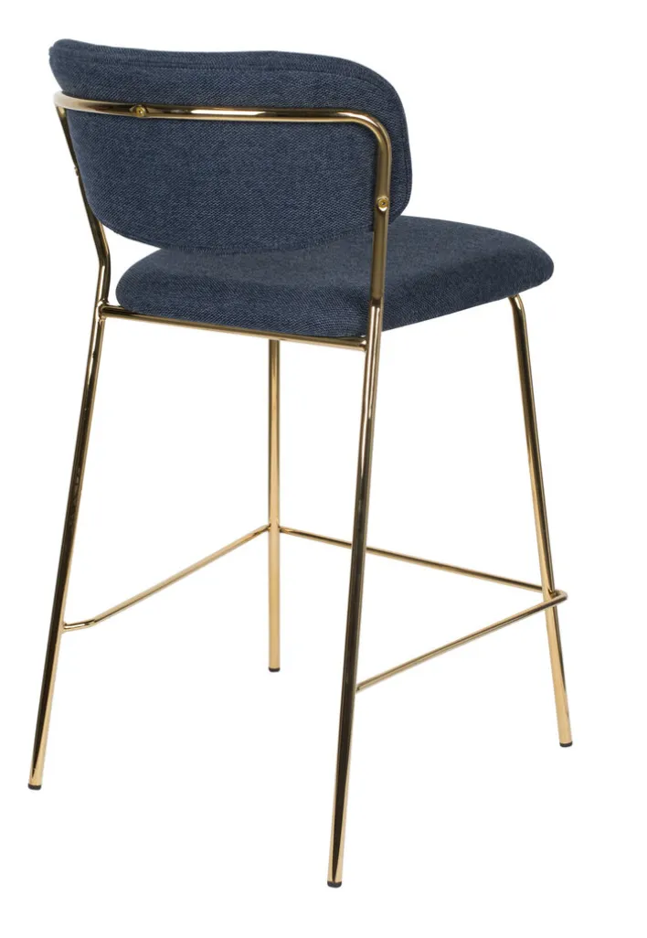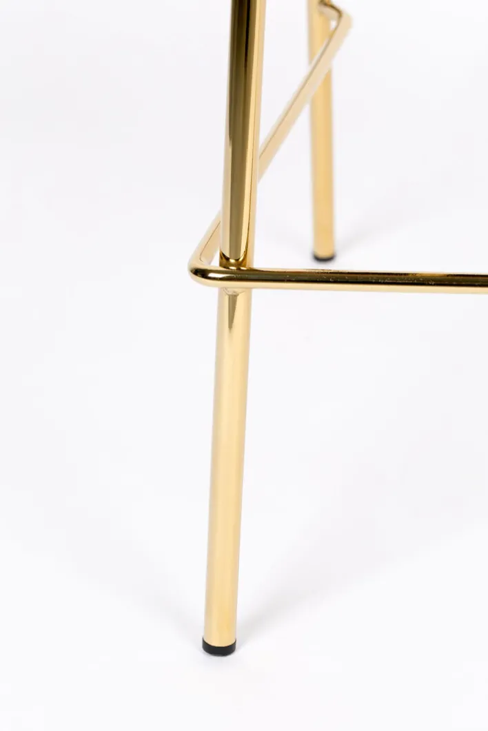 Der Barstuhl JOLIEN besteht aus einem robusten Vierfußgestell aus goldfarbigen pulverbeschichtetem Metall und einer zweigeteilten Sitzfläche und Rückenlehne. Bezogen mit einem pflegeleichten Textil aus 95% Polyester und 5% Nylon ist der noderne Barstuhl strapazierfähig, während die PUR-Schaum Polsterung auch bei längerem Sitzen für Komfort sorgt. Der hohe Sitzkomfort wird von der niedrigen, runden und leicht schräg gestellten Rückenlehne perfektioniert. Außerdem ist der Barstuhl mit einer Fußbank zum bequemen Abstellen der Füße ausgestattet.“