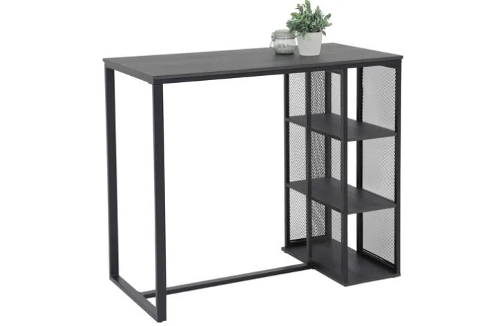 Das stabile Tischgestell des Bartischs CLARENCE besteht aus hochwertig verarbeitetem Metall. Die glatten Oberflächen sind pulverbeschichtet und dadurch strapazierfähig. Die Tischplatte ist in einer tollen Holzoptik gestaltet. Die Platte und die Kanten sind foliert. Der Bartisch ist für den Innenbereich geeignet.