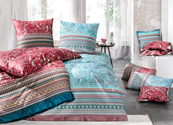 Im schönen Paisley Muster präsentiert sich diese hochwertige Mako-Satin Bettwäsche. Das orientalische Design ist sehr beliebt und eine klassische Ornamentik. Mako-Satin ist eine besondere Webart aus ägyptischer Baumwolle. Durch die sogenannte Atlasbindung entsteht eine glänzende Ober- und eine matte Unterfläche. Der Stoff dieser bunt-fröhlichen Bettwäsche BURANO V.R2 fühlt sich dadurch sehr glatt an und schmeichelt der Haut.