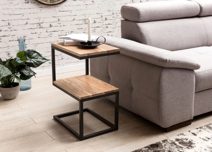 Die raffinierte S-Form und das moderne Industrial Design verleihen dem Beistelltisch eine ansprechende Optik. Das matt schwarze Gestell aus pulverbeschichtetem Eisen sorgt für eine hohe Stabilität und ergänzt sich optimal mit dem hellen Braun der beiden Tischplatten. Diese bestehen aus massivem Akazienholz und bieten ausreichend Platz für spannende Lektüre, Snacks, Getränke oder die Fernbedienung. Nicht nur im Wohnzimmer macht der 60 cm hohe Tisch eine gute Figur, auch als origineller Nachttisch oder praktische Ablage im Flur eignet er sich hervorragend.