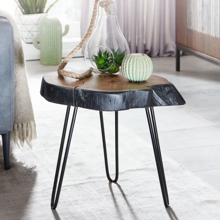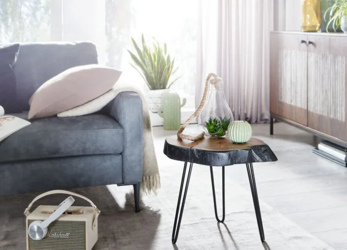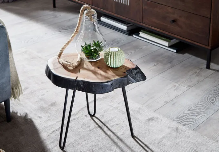 Das schwarze Metallgestell ist matt pulverbeschichtet. Der Tisch ist aufgrund seiner stabilen Konstruktion belastbar bis 30 kg. Dabei wirkt er trotz der massiven Baumscheibe filigran und leicht. Diese Wirkung wird vor allem durch die fast zierlichen drei Tischbeine hervorgerufen, die dennoch einen sicheren Stand ermöglichen. Als Beistelltisch findet er neben der Couch Platz. Platte und Dreifußgestell werden bei Bedarf einfach abgewischt.
