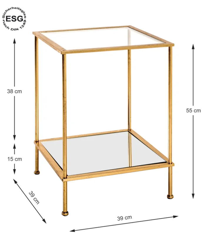 Der goldfarbige Beistelltisch hat die Maße 39 x 39 cm und bereichert die Einrichtung mit Stil und einem ästhetischen Aussehen. Durch die Tischplatte aus Glas und der Ablage aus Spiegelglas hat der kleine quadratische Tisch eine tolle Optik und passt in modern eingerichtete Wohn- und Esszimmer. Mit Vasen, Skulpturen, Bildern oder einer Topfpflanze dekoriert setzt der schöne Tisch einen tollen Akzent. Der Beistelltisch schafft eine wohnliche Atmosphäre.