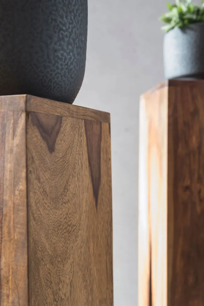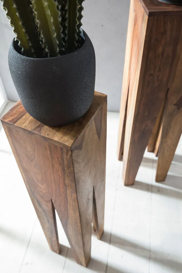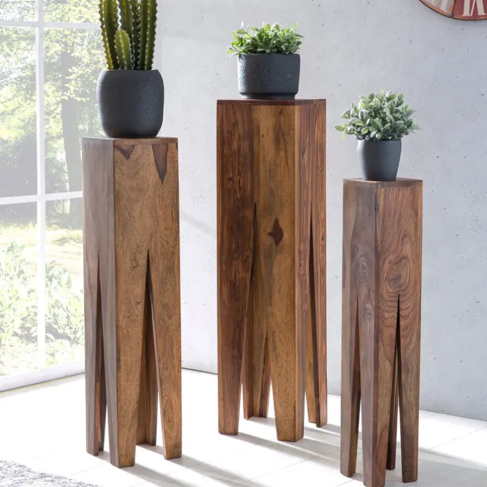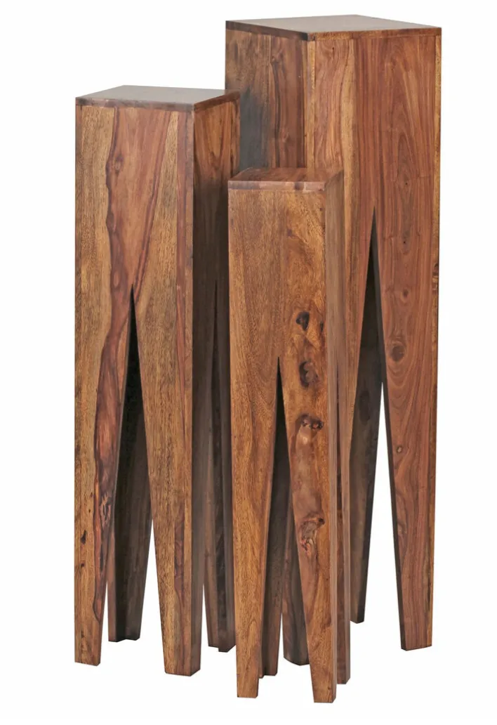 Der erste Tisch des Sets aus massivem Sheesham-Holz hat die Maße 25 x 25 x 100 cm, während der zweite die Maße 20 x 20 x 90 cm aufweist und die Maße des dritten 15 x 15 x 80 cm betragen. Alle drei Tische haben ein Vierfußgestell und sind schon für sich wunderschöne Dekorationen in etwa dem Wohnzimmer oder dem Flur, doch können sie selbstverständlich auch mit Accessoires bestückt werden, wodurch sie eine persönliche Note bekommen.
