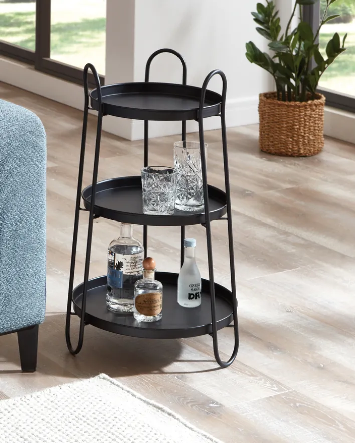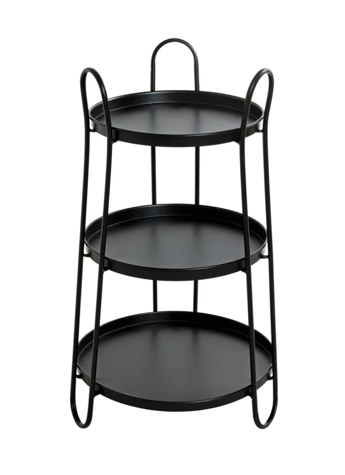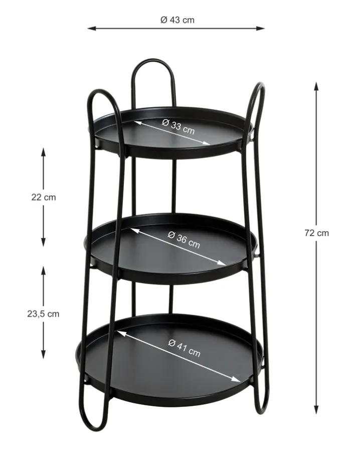 Der schwarze 43 x 43 cm große Beistelltisch ähnelt optisch einer Etagere, die den Möbeldesignern hier auch zweifelsfrei als Vorbild und Quell der Inspiration diente. Drei einzelne Ablageflächen sind bei dem Beistelltisch auf kunstvolle und lebhafte Weise miteinander verbunden – und bieten nach unten hin immer ein wenig mehr Platz.