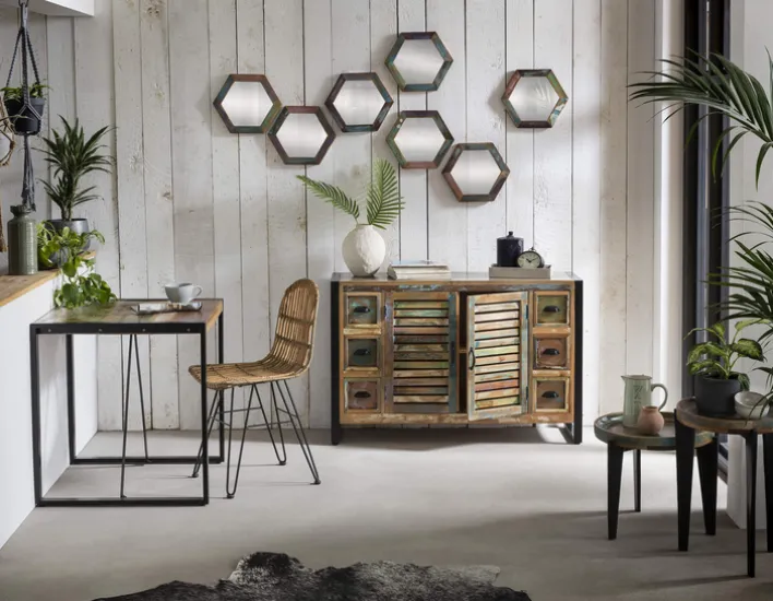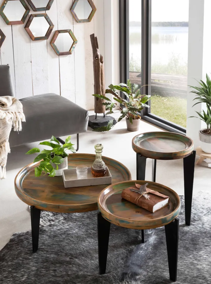 Dieser kleine Beistelltisch begeistert mit seiner runden Tischplatte, die im mehrfarbigen Design aus Altholz gearbeitet ist. Das Gestell mit drei Beinen besteht aus schwarzem Metall. Der Tisch misst 46 cm Länge und 46 cm Breite bei einer Höhe von 42 cm. Mit seinen leichten 8 kg Gewicht ist er flexibel im Raum arrangierbar.