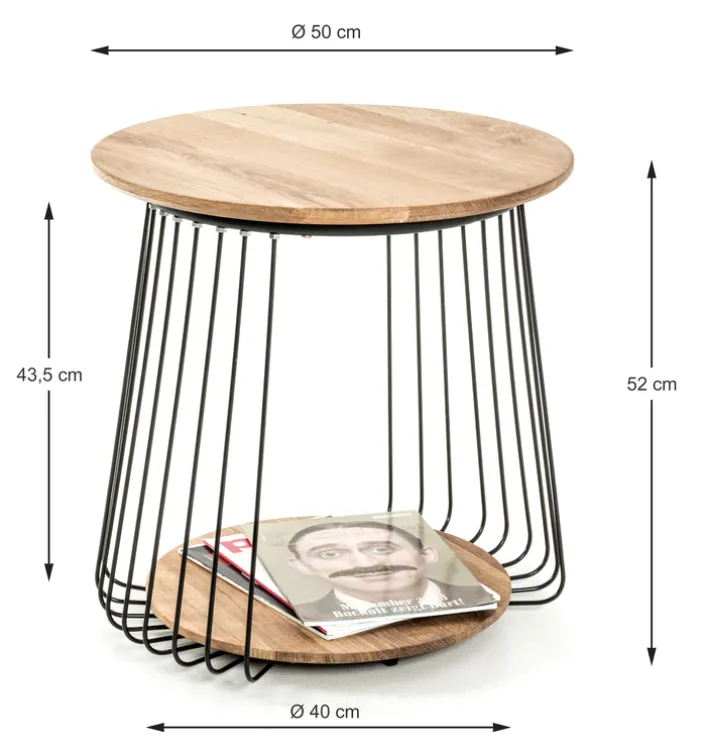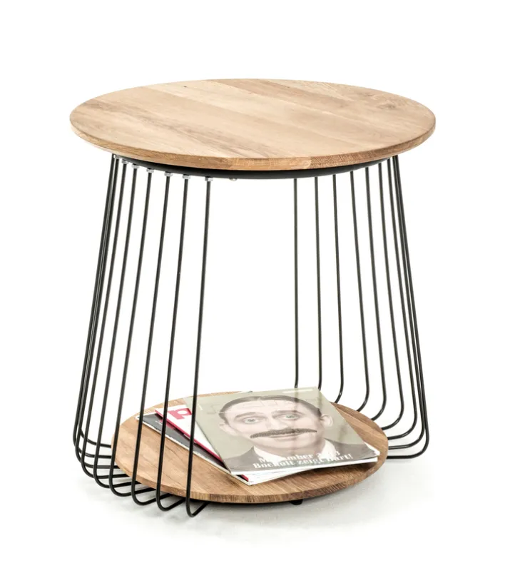 Der 50 x 50 cm große Beistelltisch aus massiver Eiche mit schwarzem Metall-Gestell spielt auf geschickte Weise mit den Kontrasten, indem er einen offenen, drahtigen und schwarzen Korpus mit zwei hellen Platten aus Eiche kombiniert. Eine davon ist als Ablage, beispielsweise für Magazine oder auch für Blumen, wunderbar geeignet, die andere könnte als Tischfläche dienen.