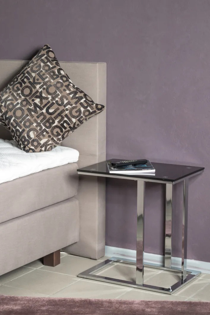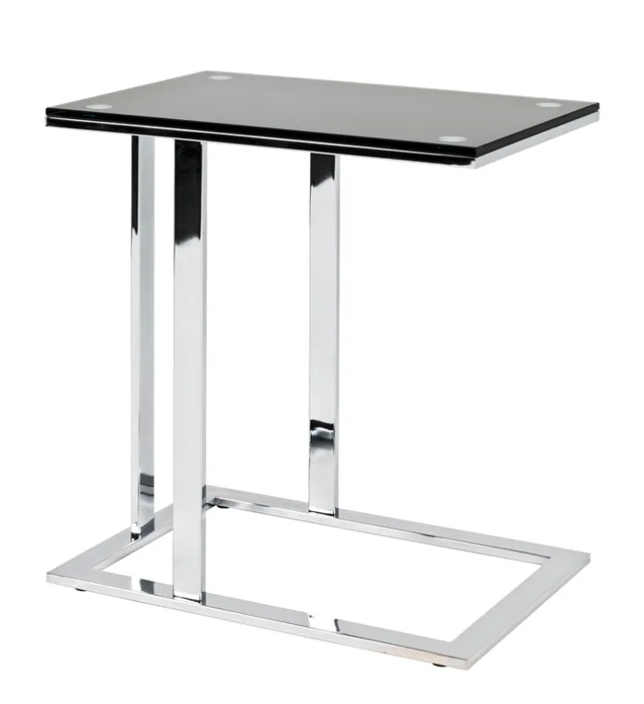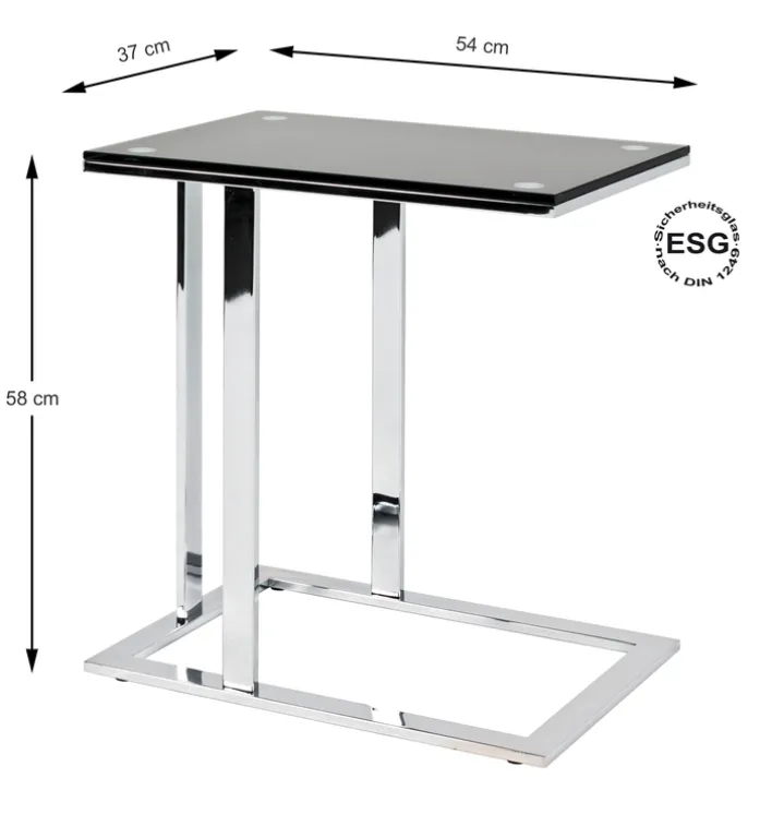 Der Beistelltisch vereint das Gestell aus chromfarbigem Vierkantstahlrohr mit einer Ablage aus schwarzem Sicherheitsglas. Mit einer Dicke von 10 mm ist die Ablage sehr robust und belastbar. Der Beistelltisch hat eine Höhe von 58 cm und kann mit seiner C-Form platzsparend unter die Couch geschoben werden. Auf seiner Ablage bietet er ausreichend Platz für Snacks, Getränke, Laptop und vieles mehr. Alltagsgegenstände sind somit stets griffbereit.