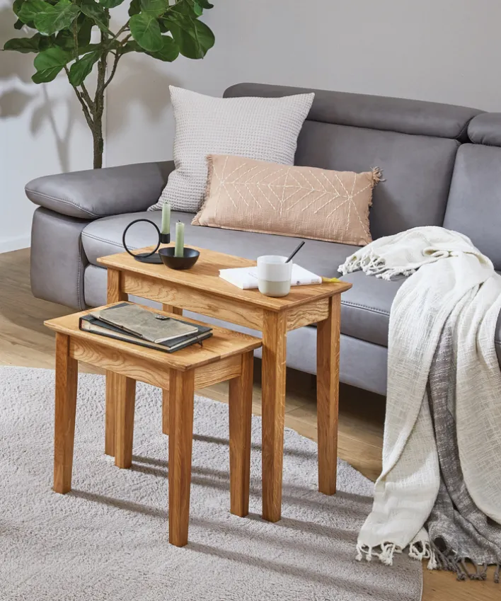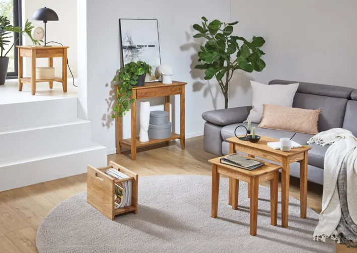 Ein kleines Tischchen, auf dem ein Buch, die Kaffeetasse oder andere Dinge abgestellt werden können, wird häufig gebraucht. Dieser Beistelltisch aus massivem Eichenholz erfüllt diese Aufgaben par excellence. Mit einer Belastbarkeit von bis zu 20 kg können auf ihm sogar schwerere Gegenstände Platz finden. Dafür sind seine Ablage mit einer Stärke von 20 mm und seine Beine mit einer Stärke von beidseitig 40 mm besonders solide ausgeführt. Ein praktischer Beistelltisch, der in keinem Haushalt fehlen darf.