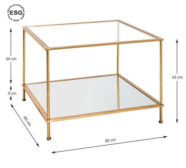 Ein filigranes Möbel im klassischen Stil und quadratischer Form, das ist der wunderschöne Beistelltisch mit einer Breite von 60,0 cm, einer Tiefe von 60,0 cm und einer Gesamthöhe von 45,0 cm. Die untere Abstellfläche ist in einer Höhe von 9,0 cm über dem Boden in den Tisch eingearbeitet. Die Ausführung in Glas plus goldfarbig eingefasstem Rahmengestell aus Metall verleiht dem Beistelltisch seine besondere Ästhetik.