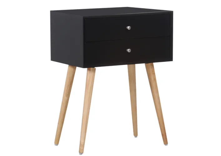 Der Beistelltisch aus der Serie Chester präsentiert sich in einem modernen, klaren Design mit rechteckiger Form. Die Maße betragen 46 cm in der Breite, 30 cm in der Tiefe und 60 cm in der Höhe bei einem Gewicht von 9 kg. Die Tischoberfläche sowie der Korpus bestehen aus schwarz lackierter mitteldichter Faserplatte (MDF), was für eine glatte, gleichmäßige Optik sorgt. Die beiden Schubkästen sind mit dezenten runden Griffen ausgestattet und bieten Stauraum für kleinere Gegenstände.