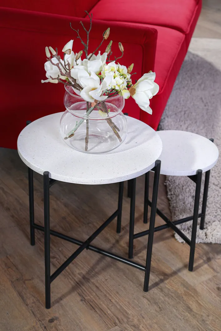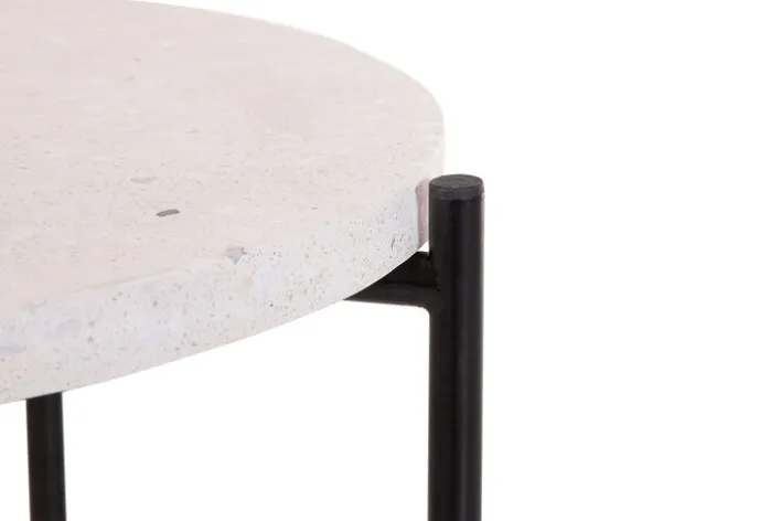 Der Beistelltisch aus der Serie MAXIMUS präsentiert sich mit einer runden Tischplatte aus weiß-grau meliertem Terrazzo-Stein. Die Oberfläche zeigt eine charakteristische Terrazzo-Struktur mit feinen Einschlüssen, die dem Tisch eine dezente, moderne Optik verleihen. Die Maße betragen 48 cm im Durchmesser sowie 50 cm in der Höhe, wodurch der Tisch vielseitig im Wohnbereich eingesetzt werden kann.