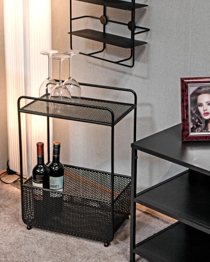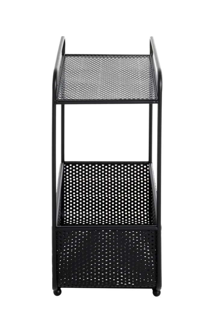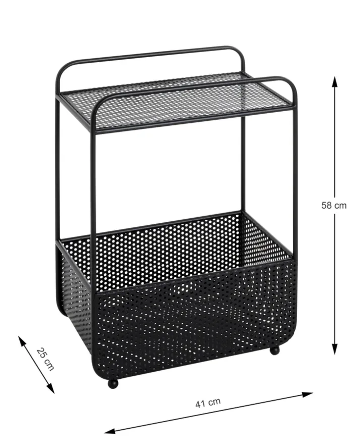 Der 58 cm hohe Beistelltisch mit Zeitungsablage besteht aus schwarz lackiertem Metall und lässt sich mit einem Gewicht von maximal 10 kg belasten. Neben der rechteckigen Tischplatte mit Lochmuster bietet er eine Zeitungsablage, die wie ein großer Korb wirkt. Der Zeitungskorb bietet viel Stauraum für Zeitungen und Magazine und verhindert mit seinen hohen Wänden, das der Lesestoff verrutscht. Auf der Ablage hält der Beistelltisch Platz für Getränke, Bücher oder Lampen parat.