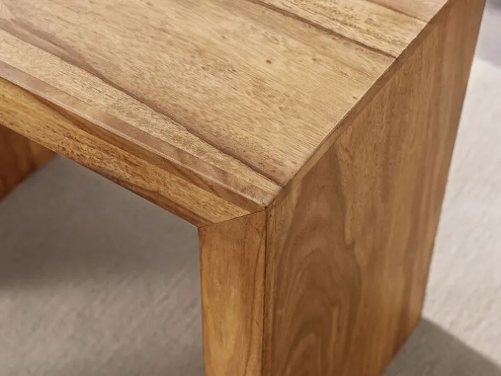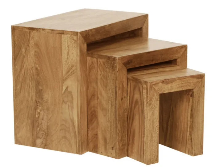 Dank ihrer natürlich warmen Optik setzen die drei Beistelltische in jedem Raum Akzente, beispielsweise im Wohn- oder Schlafzimmer. Da die Tische aus massivem Akazienholz von Hand gefertigt sind, ist jedes Exemplar ein Unikat mit einer ganz eigenen Maserung. Sollten sie mal etwas abbekommen, ist das kein Problem, denn die Tische sind leicht abwaschbar. Dank der mit bis zu 10 kg belastbaren Tische stehen Snacks, Handys und Co. immer in Reichweite. Praktisch: Werden die Beistelltische gerade nicht benötigt, lassen sie sich platzsparend ineinanderschieben.