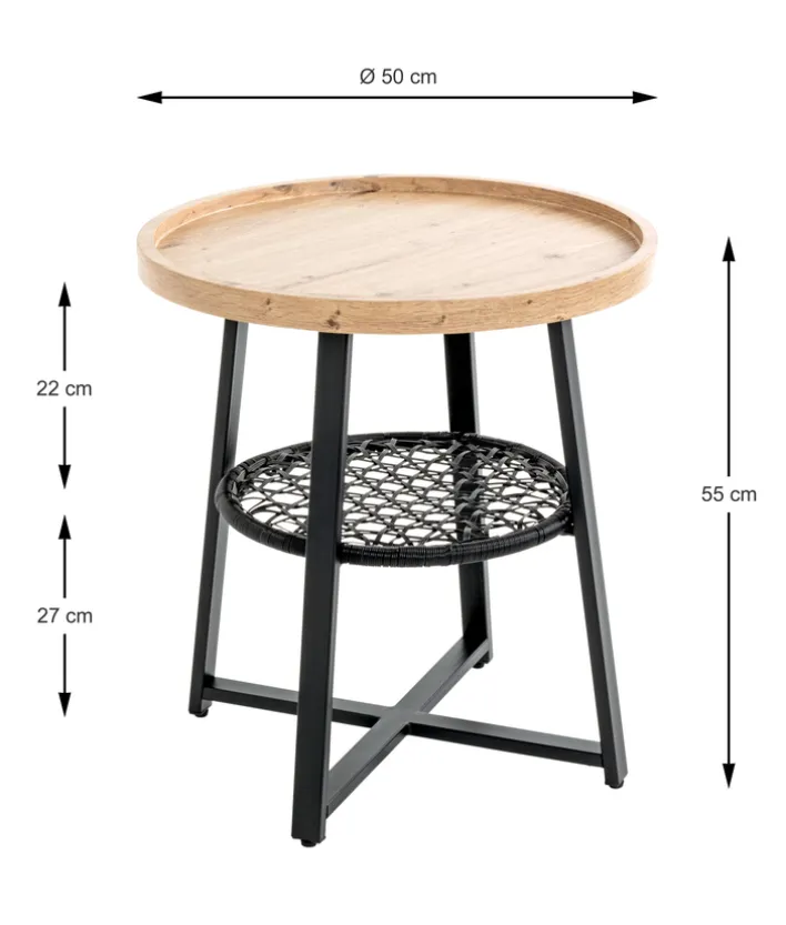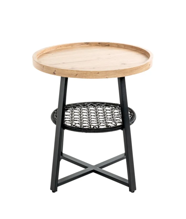 Basierend auf einem schwarz pulverbeschichteten Vierfußgestell aus Metall bietet der runde Beistelltisch einen stabilen Stand. Die Tischplatte im Eiche-Dekor verleiht ihm natürliches Flair und erinnert mit ihrem erhöhten Rand an ein Serviertablett. Unterstrichen wird die naturnahe Optik des Tischs von der Zwischenablage aus Textilgewebe in Rattan-Optik. Der Beistelltisch ist mit einem Gewicht von maximal 25 kg belastbar und ist robust genug für Getränke, Snacks und vieles mehr.