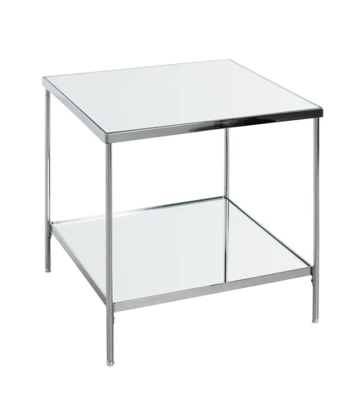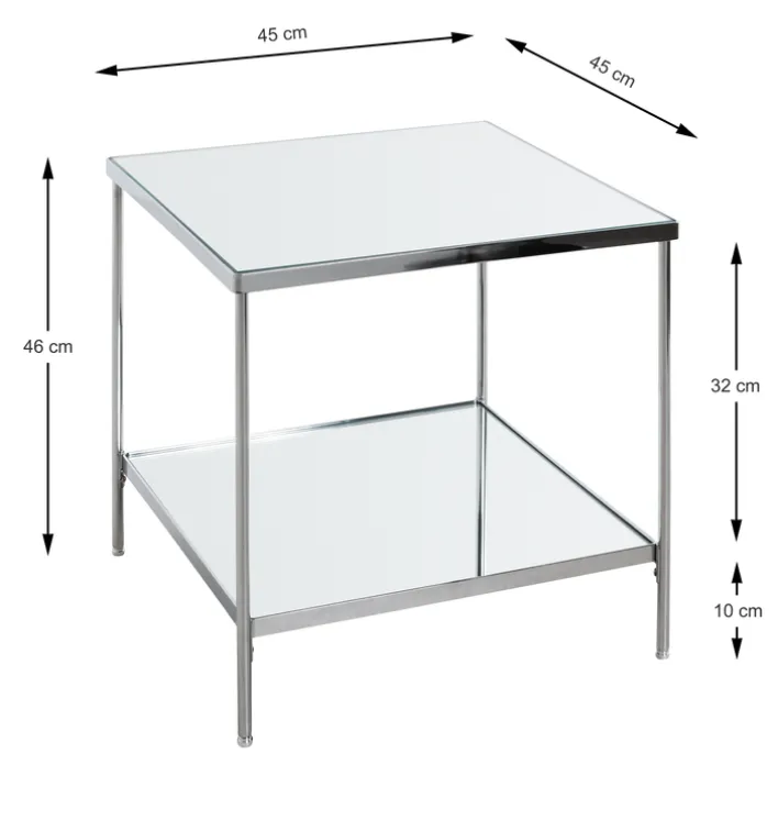 Der quadratische Beistelltisch fasziniert in der Farbe Chrom und mit den beiden Tischplatten aus robustem Spiegelglas. Das Modell mit den zwei Ablageflächen ist 45 Zentimeter breit sowie tief und 46 Zentimeter hoch, sodass die Form an einen Würfel erinnert.
