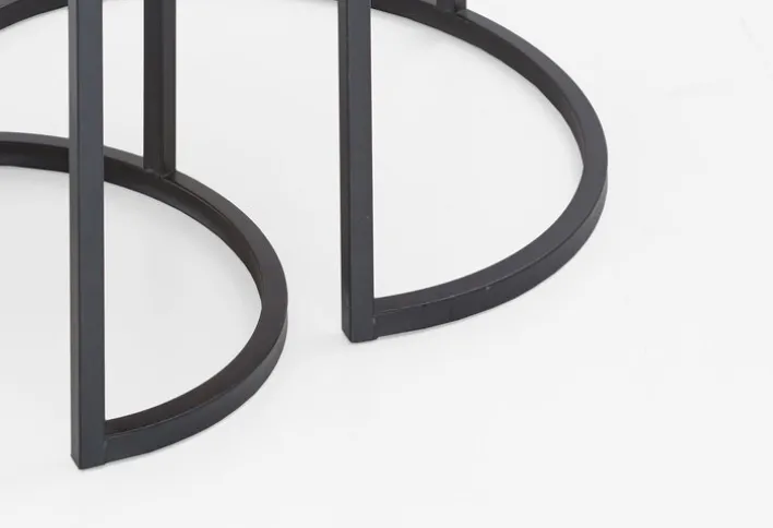 Die attraktiven Eiche-furnierten Tischplatten liegen auf schwarzen Gestellen aus Metall. Die Füße sind nicht im Kreis geschlossen, sondern halbrund offen. Diese Optik bringt Lebendigkeit und Bewegung in den Raum. Die schicke Beistelltisch-Kombination passt zu vielen Einrichtungsstilen.