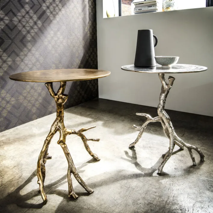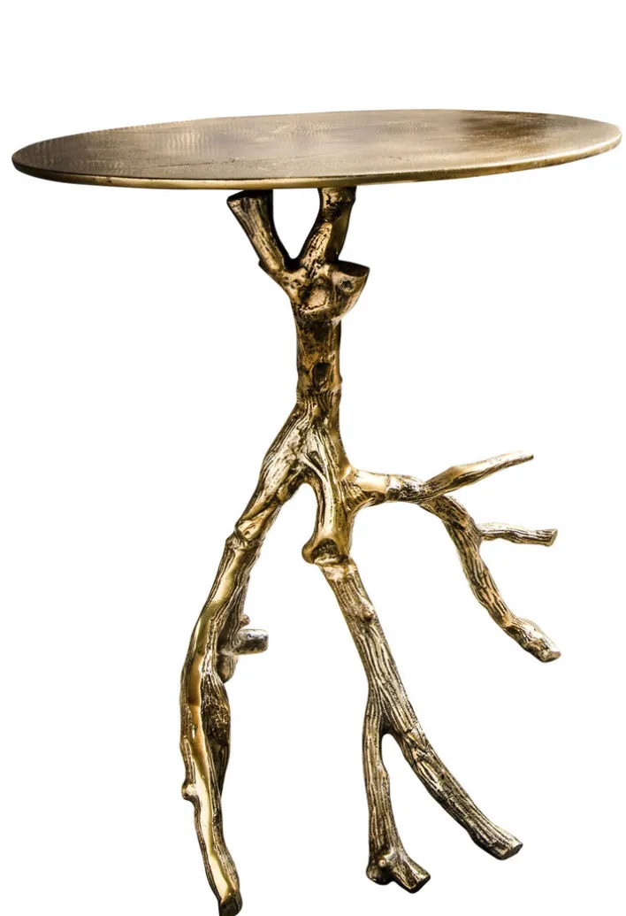 Der runde Beistelltisch BRANCH GOLD der Trendmarke More2Home hat eine Höhe von 52 cm und einen Durchmesser von 42 cm. Er ist aus goldfarbigem Aluminium mit antikem Touch hergestellt.