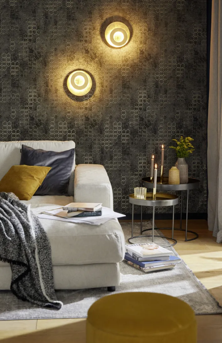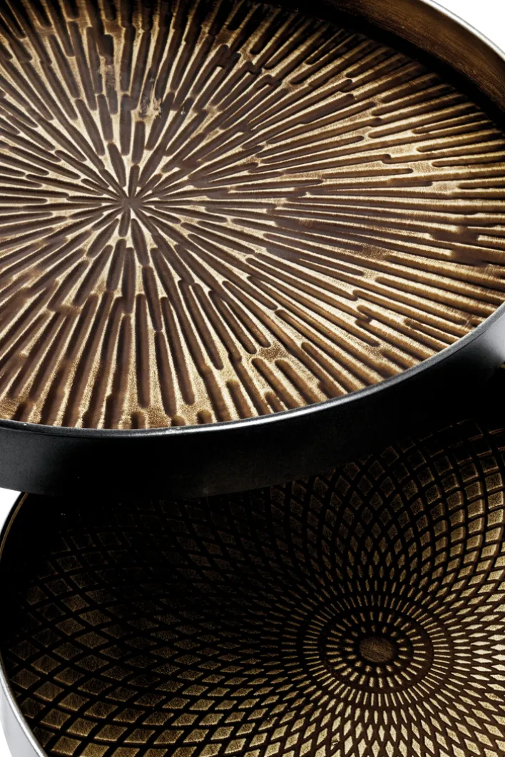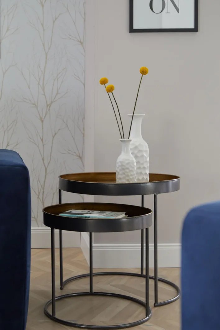 Das Beistelltisch-Set Celle bietet ihnen mit den beiden Tischen vielfältige Möglichkeiten. Beide haben eine runde Tischplatte, die mit grafischen Mustern unterschiedlich gestaltet sind. Die grazilen Metallgestelle verschaffen dem Set eine luftige Optik und bilden einen freundlichen Anblick. Die beiden Tische des Beistelltisch-Sets Celle können unterschiedlich zueinander positioniert werden. So lassen sie sich individuell an die Gegebenheiten bei Ihnen Zuhause anpassen. Die dekorativen Tische sind ein toller Anblick in jedem Raum, egal ob Wohnzimmer, Schlafzimmer oder Wintergarten.