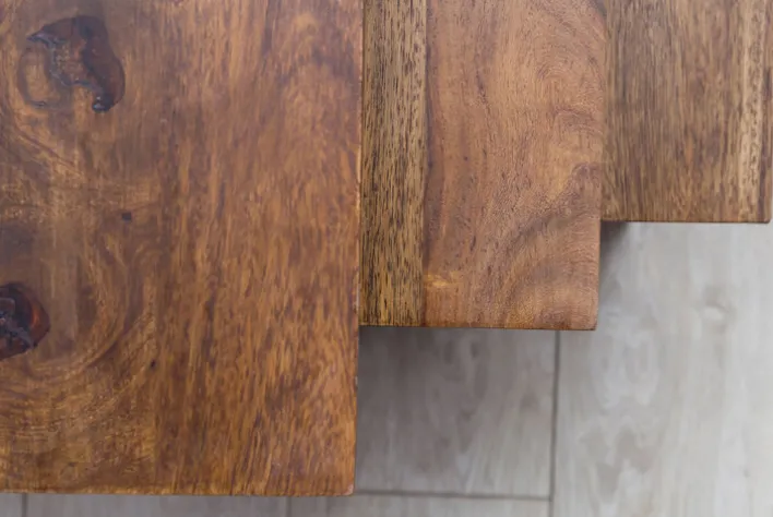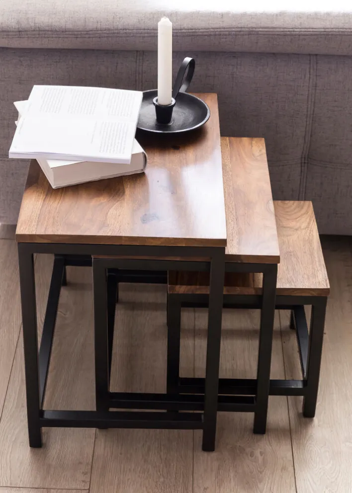 Zum Beistelltisch gehören zwei rechteckig und ein quadratisch geformter Ablagetisch. Die Platten sind aus massivem Rosenholz mit gebeizter Oberfläche gefertigt. Die dekorative Maserung macht den besonderen Charme der Möbelstücke aus. Das Material harmoniert optisch ideal mit den Vierfußgestellen der Tische, die aus pulverbeschichtetem, schwarzem Metall bestehen.